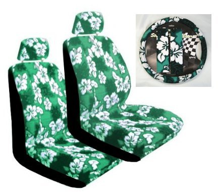 2 Hawaiian Hibiscus Low Back Seat Covers, and Wheel Cover Set - Hibiscus Green