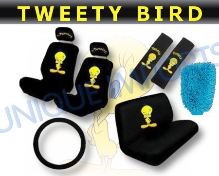 - Tweety Bird Complete Auto Interior Gift Set includes 2 bucket seat covers, 2 headrest covers and 1 bench seat cover 1 top and 1 bottom and a steering wheel and shoulder pads & bonus detaling wash mitt
