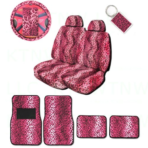 Wild for Safari! Pink leopard seat covers wheel cover, floor mats and key fob setUniversal fit seat cover does not contour to the exact indentation and raise of any make and model's seat. *WILL NOT FIT SEATS WITH ANY OF THE FOLLOWING: 1. INTEGRATED SEAT BELT. 2. SIDE AIRBAG. 3. OVERSIZED SEAT (captain seat). 4. SEATS WITH ARMREST 5. NO REMOVAL HEADRES. Wheel cover design to fit steering wheel between 14.5 - 15.5 inch. Univeral fit Front Mat approximate size 27 x 17 inches. Universal utility rear mat approximate size 17 x 13 inches.